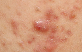 여드름 환자가 매우 싫어하는 형태로 하나 하나의 여드름이 화농하여 피부 깊숙이 농포를 만들고 있는 단계입니다.